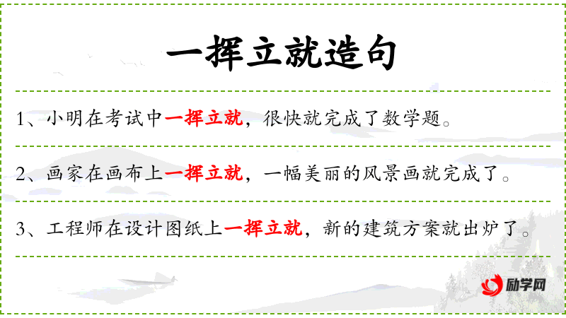 - 一挥立就:形容动作迅速、熟练,立即完成。