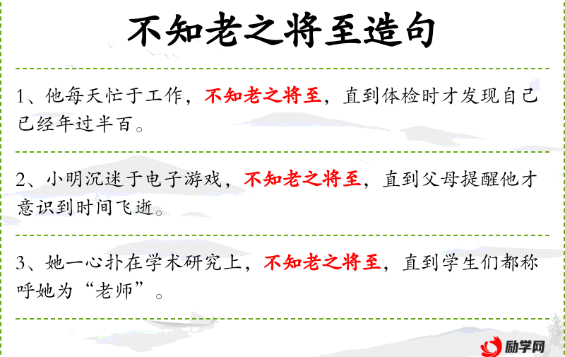 1. 【不知老之将至】 不知道老年即将来临。形容人专心工作,心怀愉快,忘掉自己的衰老。