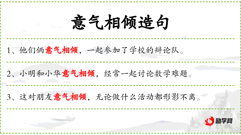 - 意气相倾:表示两人志趣相投,情感上相互吸引。