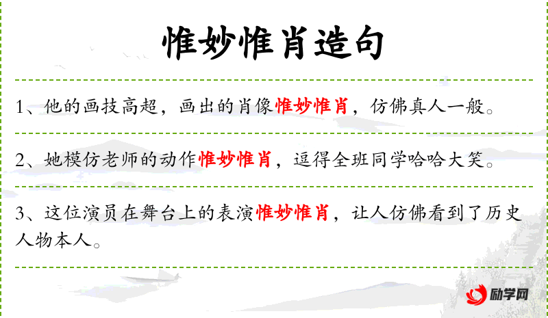 - 惟妙惟肖:形容描绘或模仿得非常逼真,同义词有“栩栩如生”、“活灵活现”。