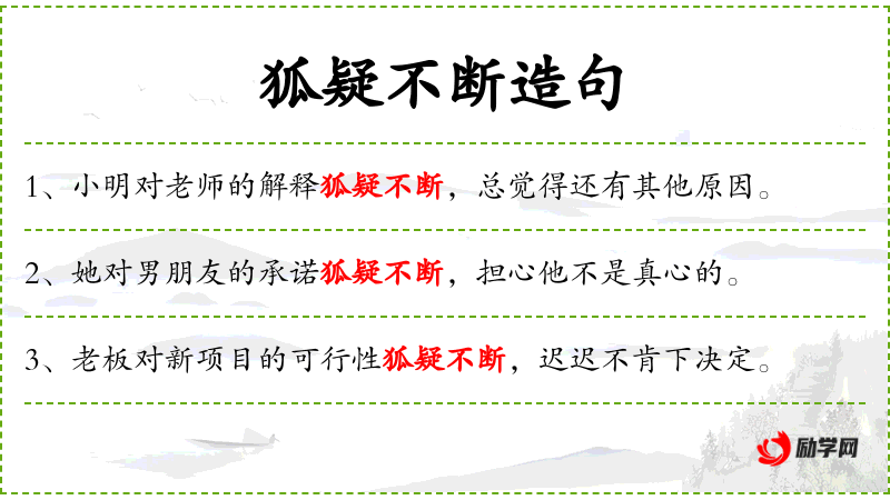 2. 【狐疑不断】 狐疑:犹豫,狐性多疑。传说狐狸多疑。形容心里疑惑,一时决定不下来。