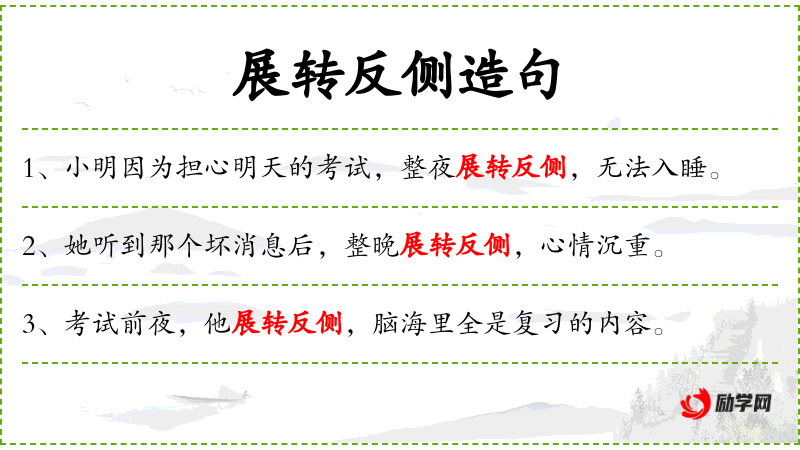 句子:“考试前夜,他展转反侧,脑海里全是复习的内容。”