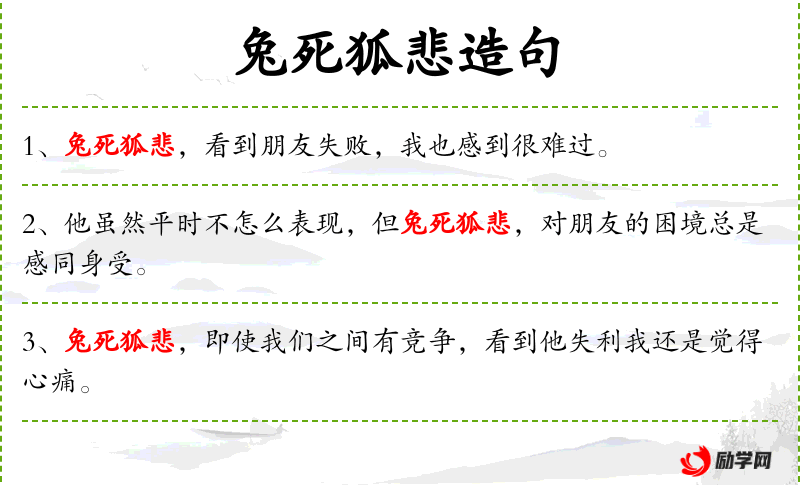 - 兔死狐悲:这是一个成语,意思是比喻因同类的不幸而感到悲伤。