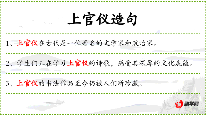 2. 【上官仪】 唐代诗人。字游韶,陕州陕县(今属河南)人。贞观初进士。曾位居宰相◇被武则天所杀。诗风华美绮丽,有上官体”之称。又归纳诗歌中的对仗方法,提出六对”、八对”之说,对律诗的定型有一定影响。
