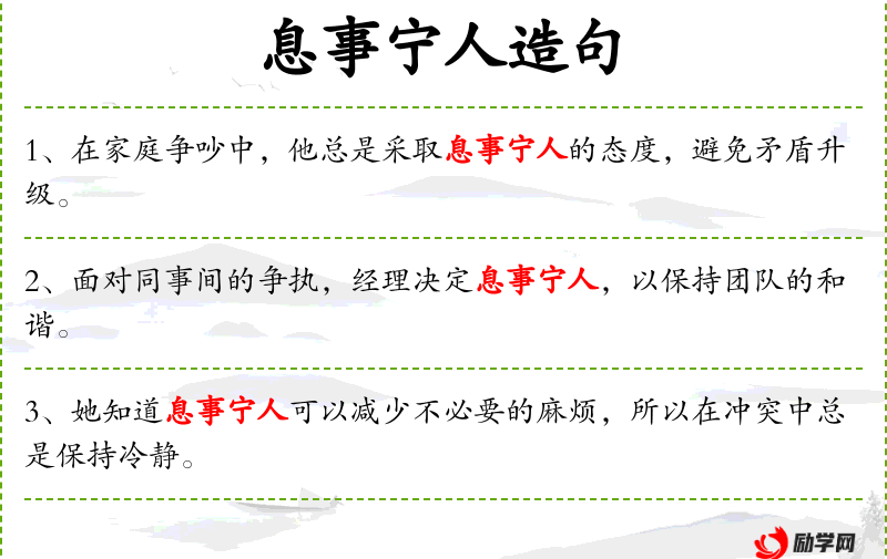 - 息事宁人:这个成语源自**传统文化,意指通过和解或妥协来平息纷争。