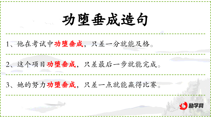 - 功堕垂成:意指工作或努力即将完成,但尚未完全成功。