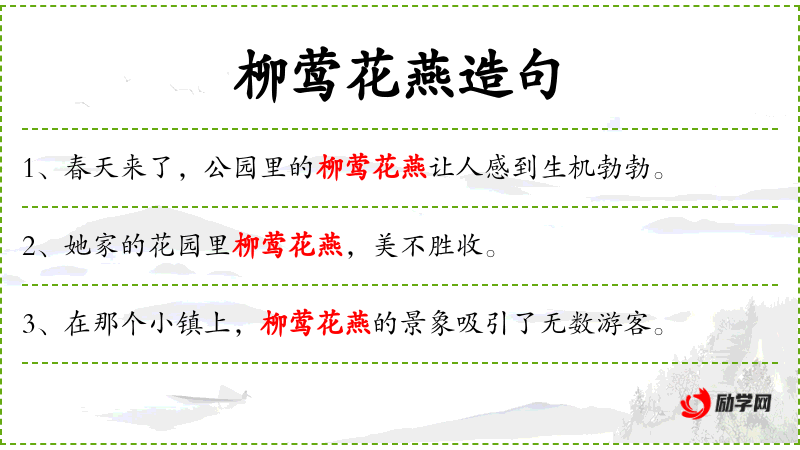 1. 【柳莺花燕】 - 指柳上莺歌,花间燕语。指美好的春景。