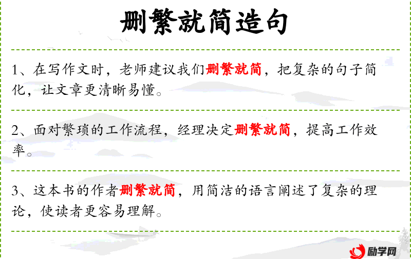 3. 【删繁就简】 删:除去;就:趋向。去掉繁杂部分,使它趋于简明。