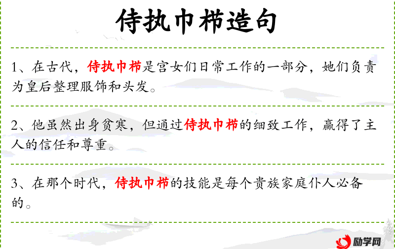 - 侍执巾栉:指的是古代侍者为贵族或主人服务的具体工作,如整理衣物、打理日常用品等。