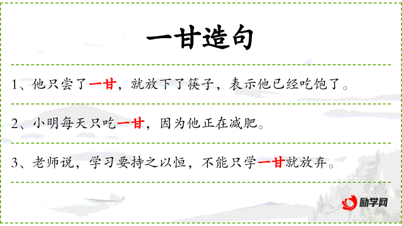 《晋书.王羲之传》"率诸子,抱弱孙,游观其间,有一味之甘,割而分之。"后因以"一甘"指一味美食。