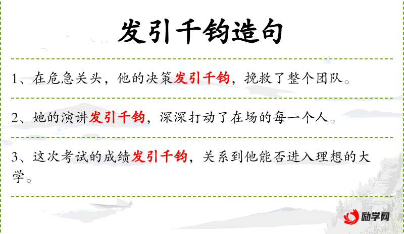 - 发引千钧:这个成语源自**文化,比喻情况极其危急或影响极其重大。