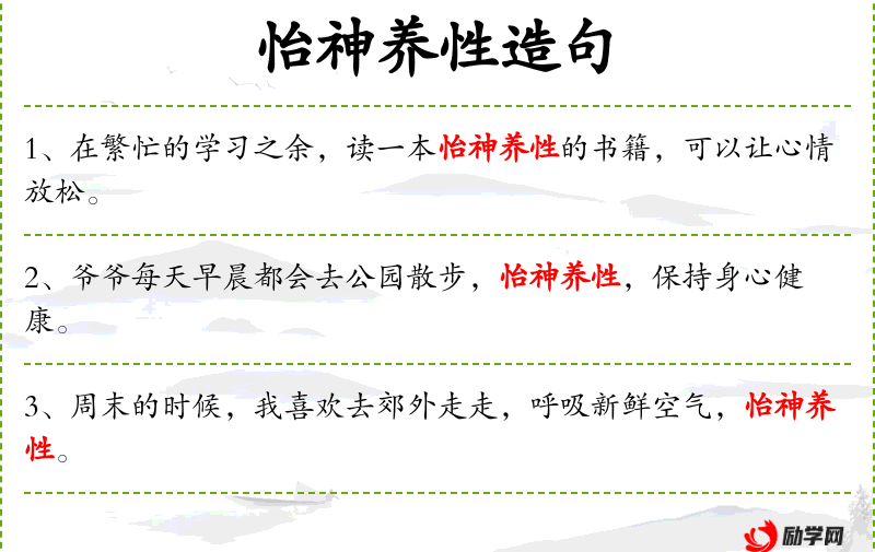 1. 【怡神养性】 怡:使愉悦。让自己精神愉悦以保养本性