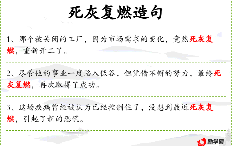 1. 【死灰复燃】 - 冷灰重新烧了起来。原比喻失势的人重新得势。现常比喻已经消失了的恶势力又重新活动起来。