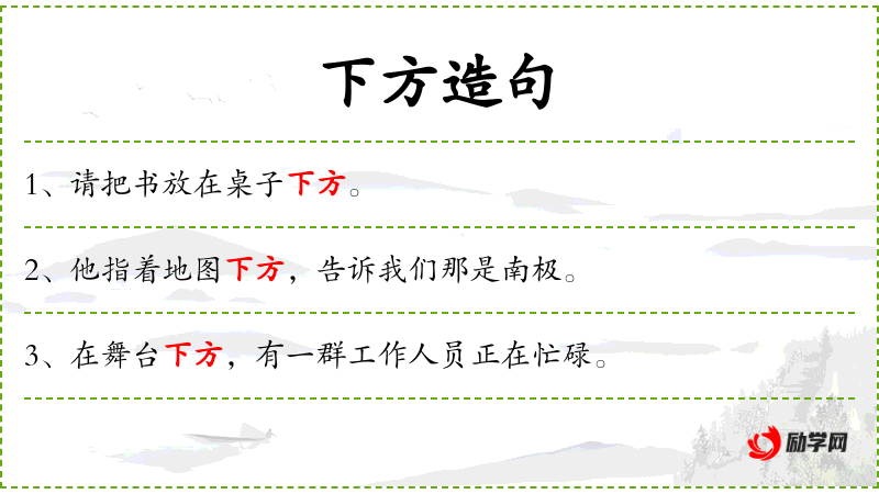 1. 【下方】 - 下边;下面; 犹下界,人间; 汉代五行家称南方或西方为"下方"。