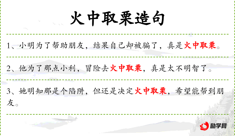 1. 【火中取栗】 - 偷取炉中烤熟的栗子。比喻受人利用,冒险出力却一无所得。