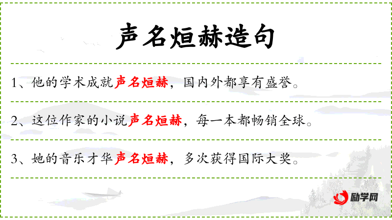 - 声名烜赫:形容名声非常显赫,烜赫(xuǎn hè)是一个形容词,表示非常显著或突出。