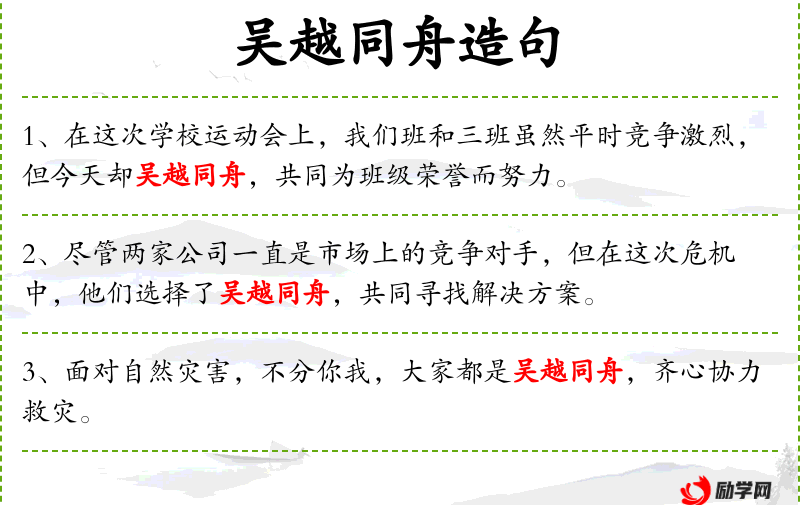 - 成语典故:吴越同舟源自**古代吴国和越国的故事,强调在困难面前团结一致。