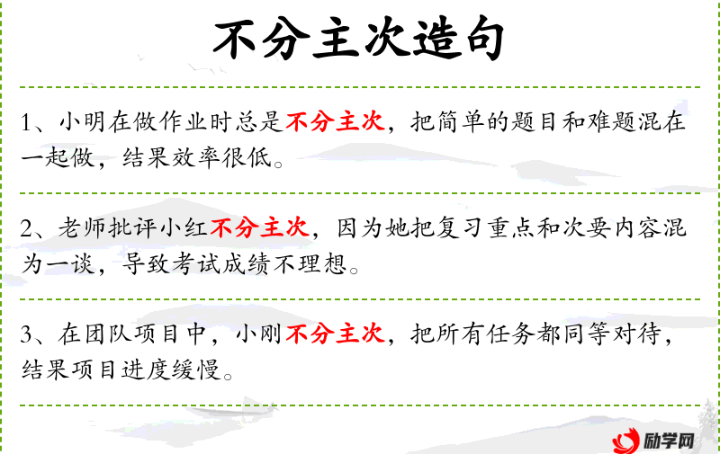 1. 【不分主次】 指人办事不能分辨主要的和次要的。