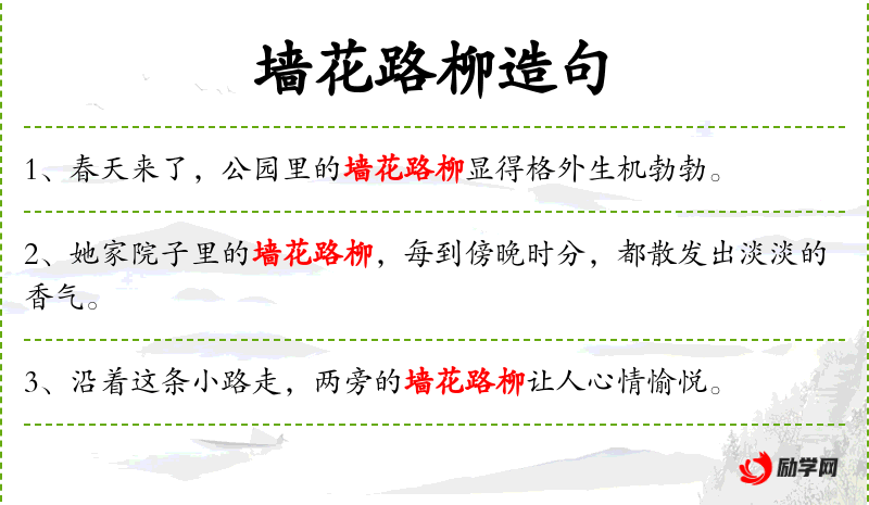- 墙花路柳:名词短语,形容环境优美,有诗意。