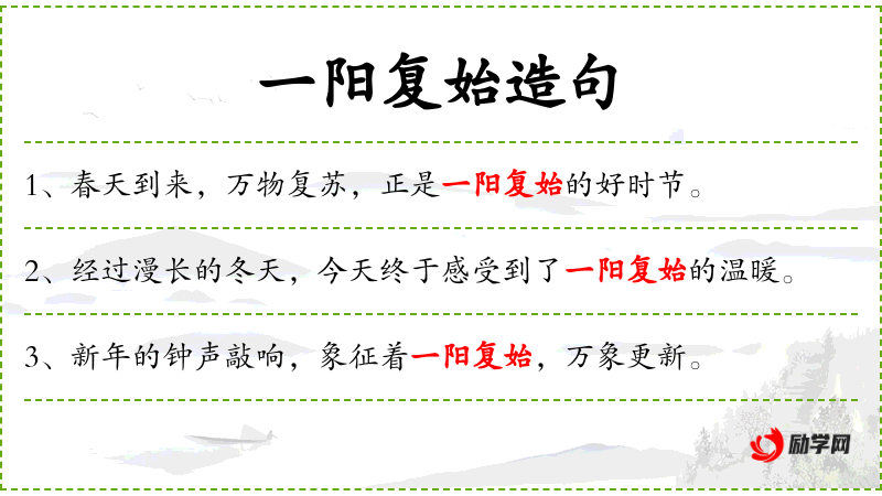 - 一阳复始:成语,意指阳气开始复苏,常用来形容新年或春天的到来。