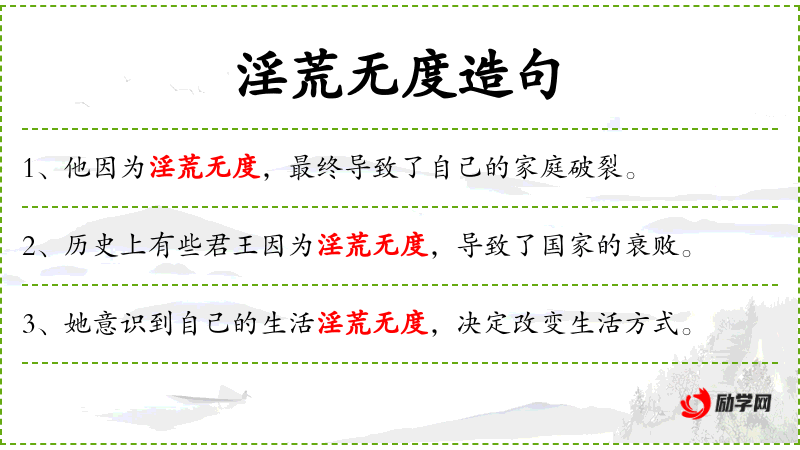1. 【淫荒无度】 - 淫:淫乱;度:限度;荒:荒唐。形容征逐酒色,生活糜烂。