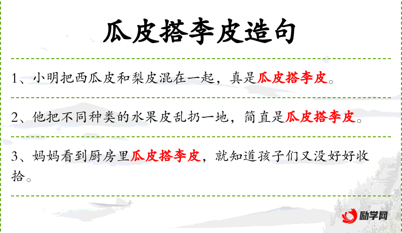 1. 【瓜皮搭李皮】 - 搭:连接上,挂上。瓜皮挂在李子树皮上。比喻和毫无关系的人强认亲族。