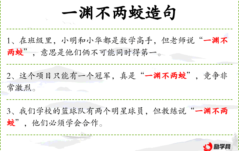 - 文化背景:成语“一渊不两蛟”体现了**文化中对于团队精神和集体利益的重视。
