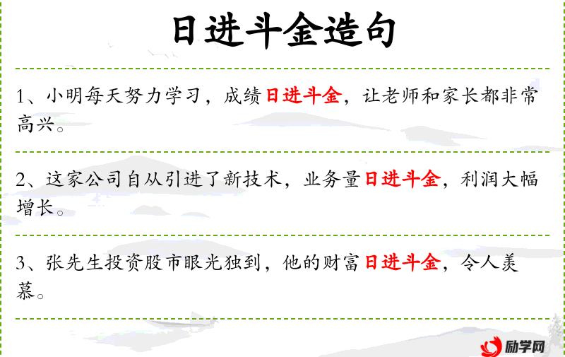 - 日进斗金:这个成语源自**古代,斗是古代的量器,形容财富增长非常快。