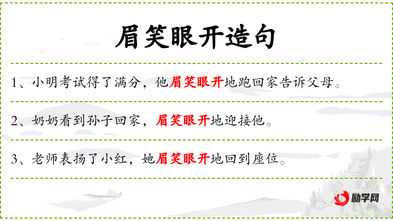 3. 【眉笑眼开】 - 眉头舒展,眼含笑意。形容高兴愉快的样子。