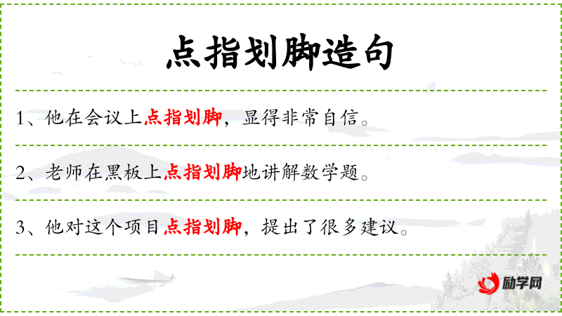 5. 【点指划脚】 - 形容说话时兼用手势示意。多形容说话放任不拘,或轻率地指点、批评。同“点手划脚”。