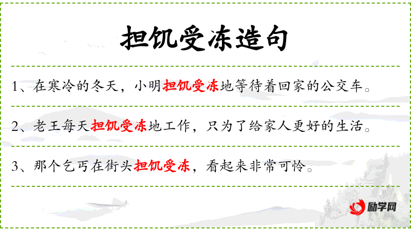- 担饥受冻:形容词短语,表示忍受饥饿和寒冷。