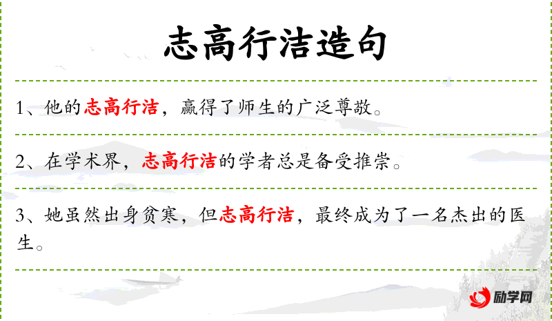 - 志高行洁:形容词短语,意为有高尚的志向和纯洁的行为。