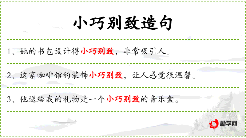 - 小巧:形容词,形容物体小而精致。