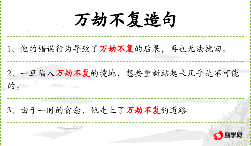 1. 【万劫不复】 佛教称世界从生成到毁灭的一个过程为一劫,万劫就是万世的意思。指永远不能恢复。