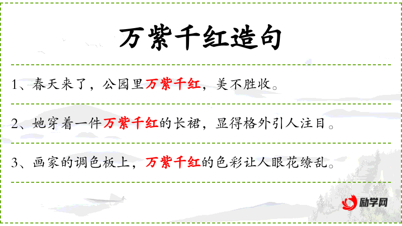 - 一片万紫千红的景象:形容色彩丰富、绚丽多彩的景象。
