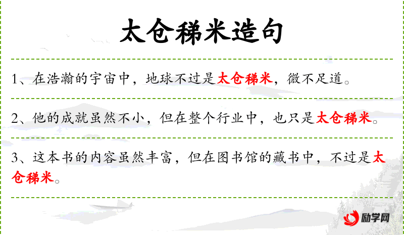 - 太仓稊米:比喻微不足道的东西,源自《庄子·逍遥游》。