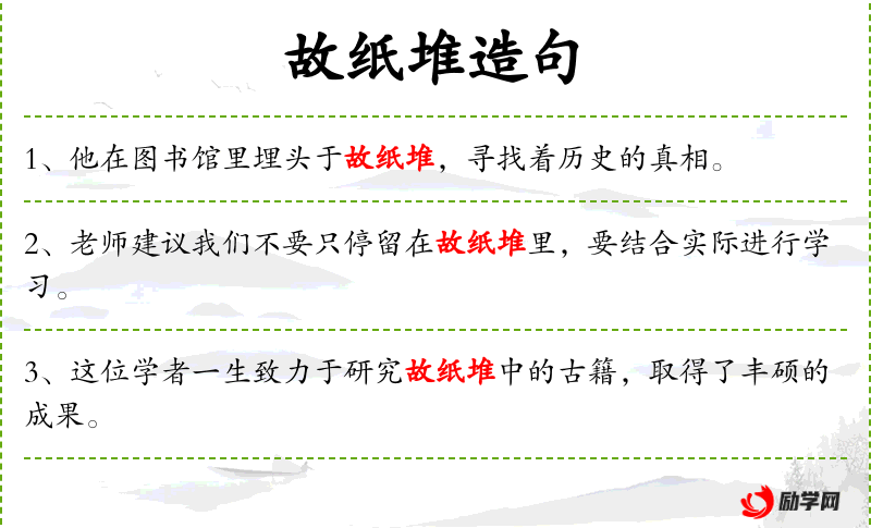 - 故纸堆:名词,指旧的书籍、文件等堆积的地方,常用来比喻历史或传统。