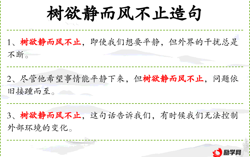 1. 【树欲静而风不止】 - 树想要静下来,风却不停地刮着。原比喻事情不能如人的心愿。现也比喻阶级斗争不以人们的意志为转移。
