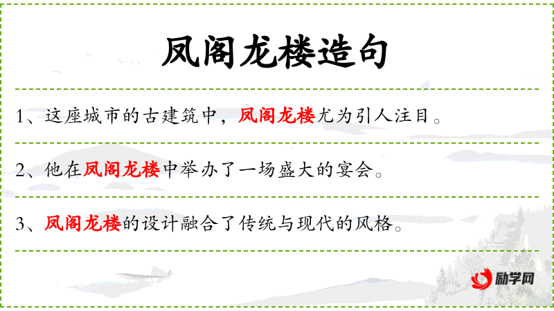 - 凤阁龙楼:指代具有**传统特色的建筑,其中“凤阁”和“龙楼”都是象征高贵和吉祥的建筑名称。