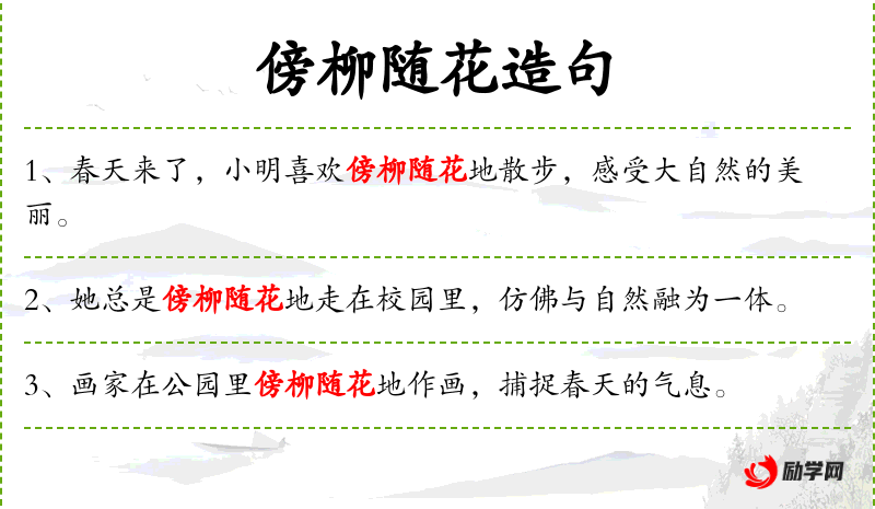 句子:“在春日的午后,我们傍柳随花地坐在湖边,静静地看着水面上的倒影。”