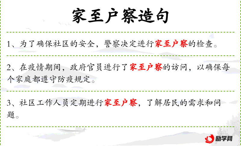 - 家至户察:from house to house, thorough
