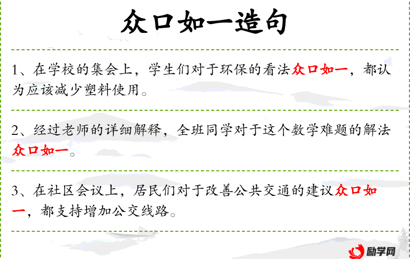 - 众口如一:形容大家的意见或说法完全一致。