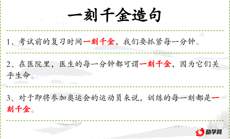 1. 【一刻千金】 一刻时光,价值千金。形容时间非常宝贵。