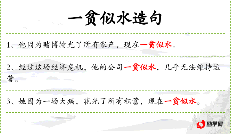 1. 【一贫似水】 穷得象用水洗过似的,什么都没有。形容十分贫穷。