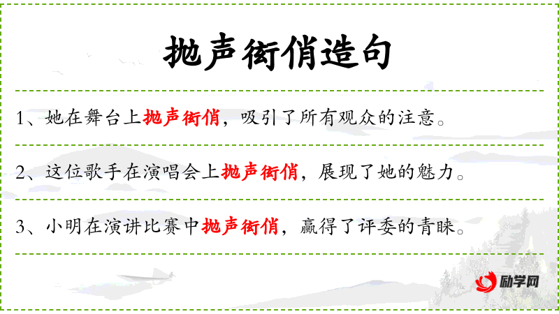 - 抛声珒俏:这个词组较为文学化,意指主持人以生动、有趣的方式表达,使声音和表情都显得活泼。