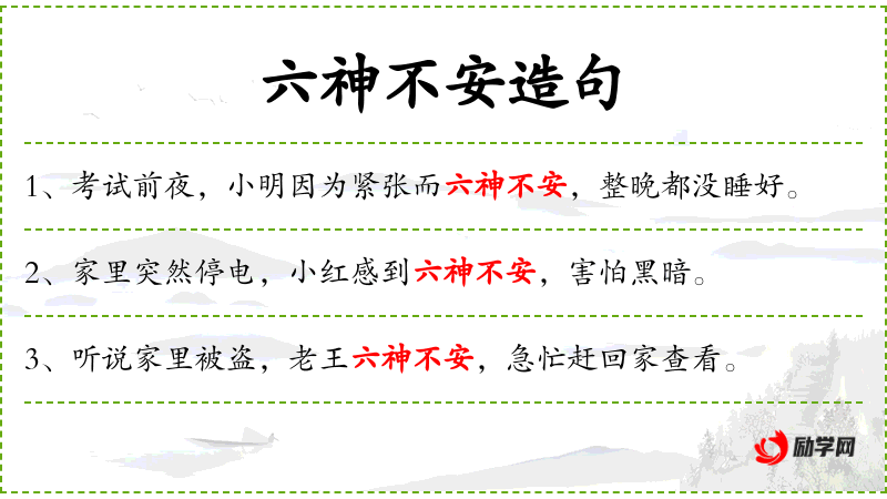 - 六神不安:成语,形容心神不定,非常焦虑。