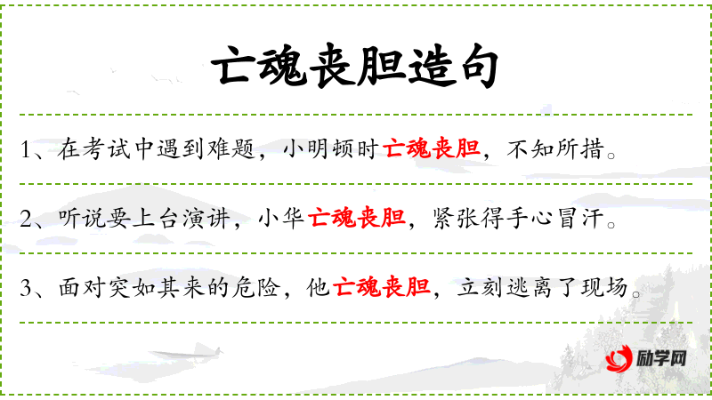 - 谓语:亡魂丧胆,紧张得手心冒汗