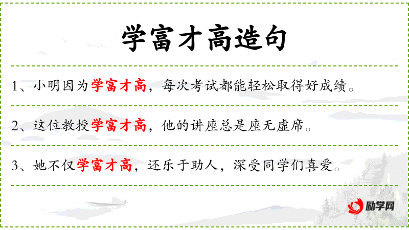 - 学富才高:形容一个人学识渊博,才华横溢。