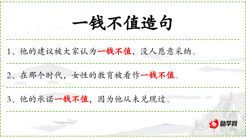 - 宾语:“一钱不值”