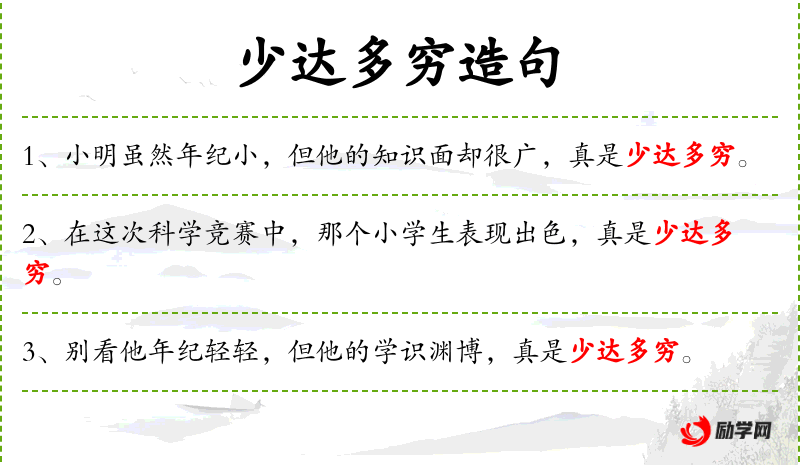 - “少达多穷”:这个成语并不存在,可能是笔误或误解。正确的成语可能是“少壮不努力,老大徒伤悲”,意指年轻时不努力,年老时会后悔。